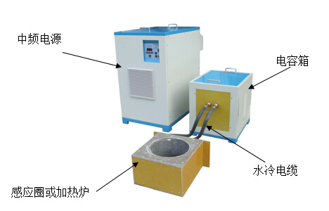 常規(guī)情況下,雙平提供的中頻電源、電容箱和加熱爐如下圖所示。中頻電源和電容箱之間采用同軸電纜連接,電容箱與感應(yīng)圈間采用水冷電纜連接。